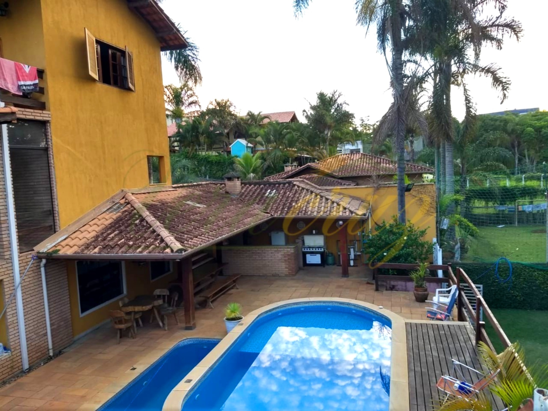 Já na parte externa não irá faltar opção quando o assunto for relaxar e se divertir com sua família, são 2 piscinas aquecidas, com toboágua e cascata, uma amplo espaço gourmet com 2 churrasqueiras e fogão a lenha, campo de futebol, um bosque ao fundo da propriedade com arvores frutíferas e saída para o Rio Jaguari.