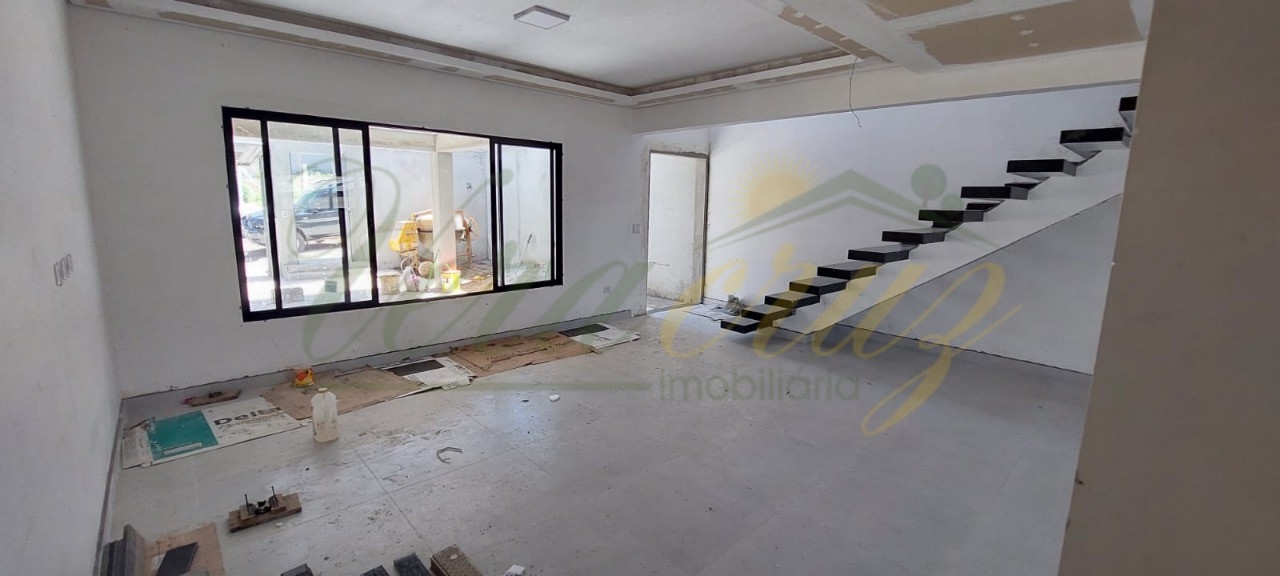 São 190m² de área construída, sendo o piso inferior composto por sala de estar ampla com 3 ambientes, uma cozinha espaçosa, um lavabo, área de serviço, jardim, quintal e garagem para até 3 carros.