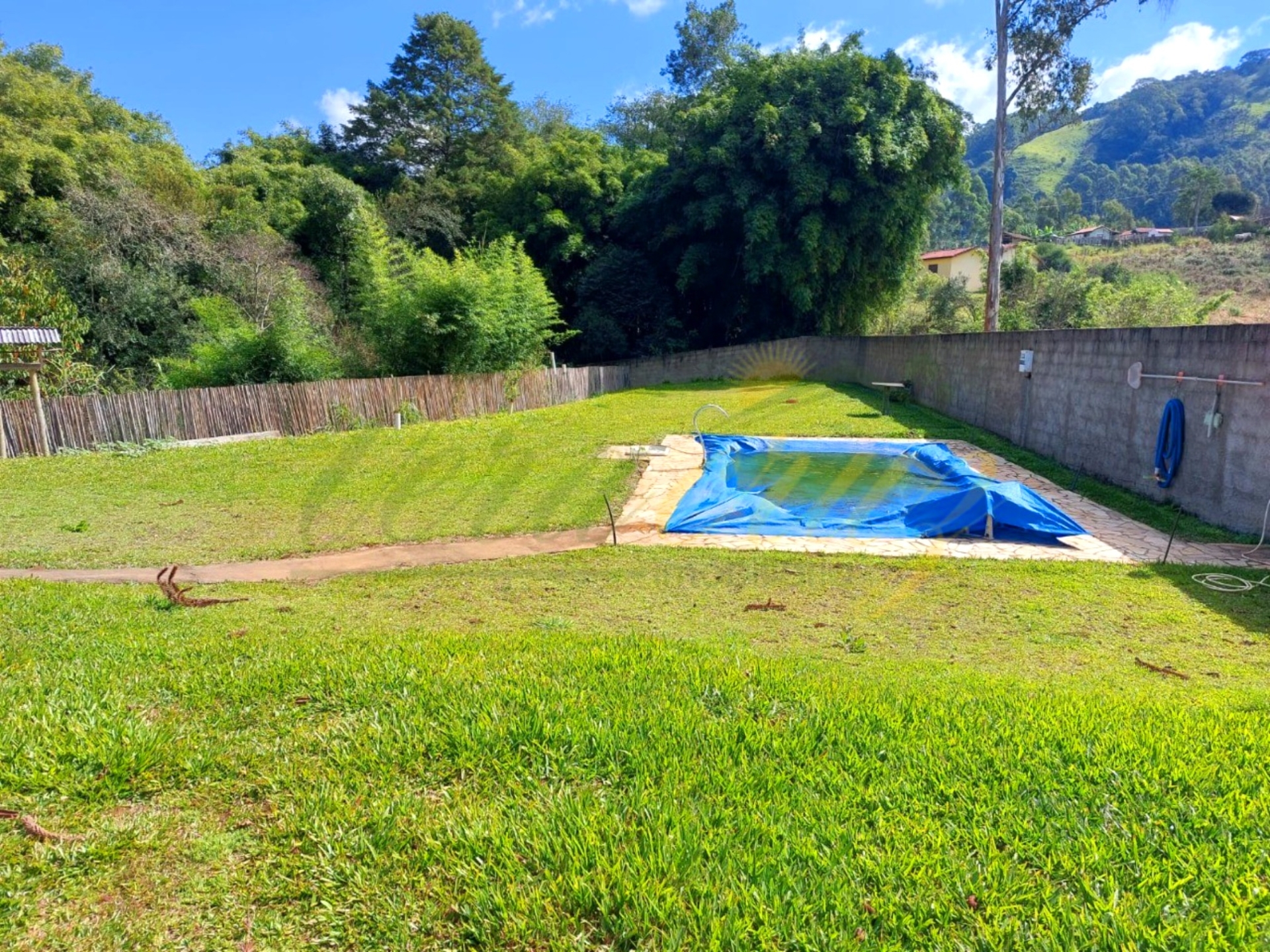 . Área plana gramada em volta da casa
